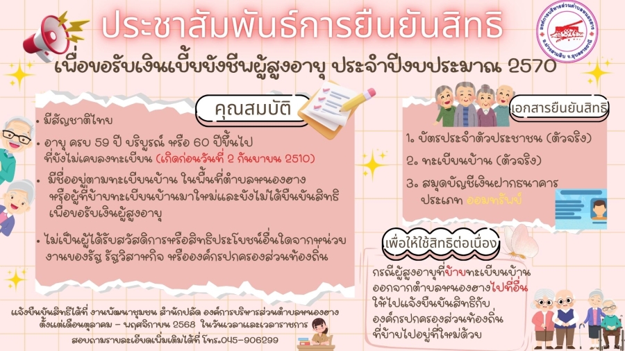 ประชาสัมพันธ์ การยืนยันสิทธิรับเบี้ยยังชีพผู้สูงอายุ ประจำปีงบประมาณ พ.ศ.2570